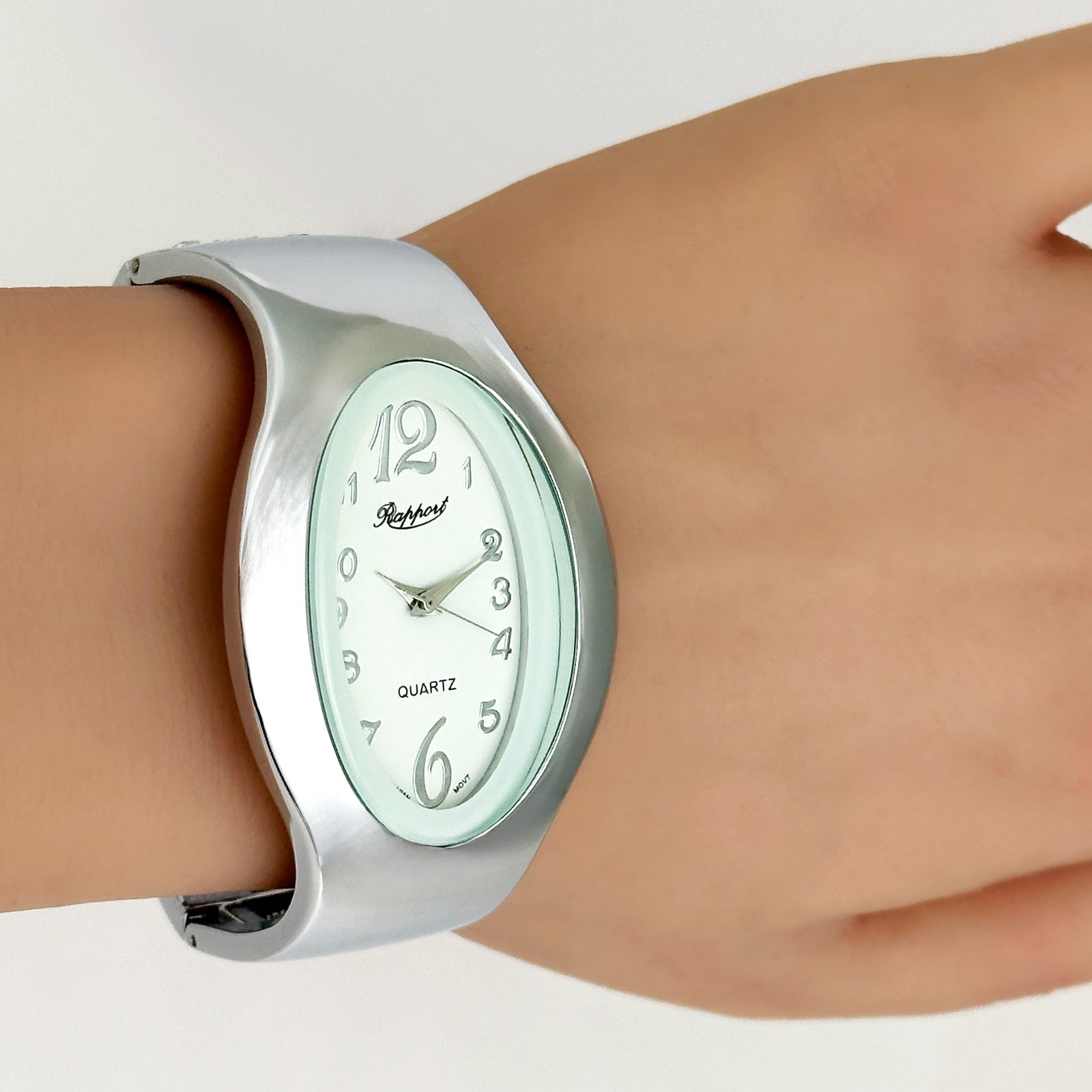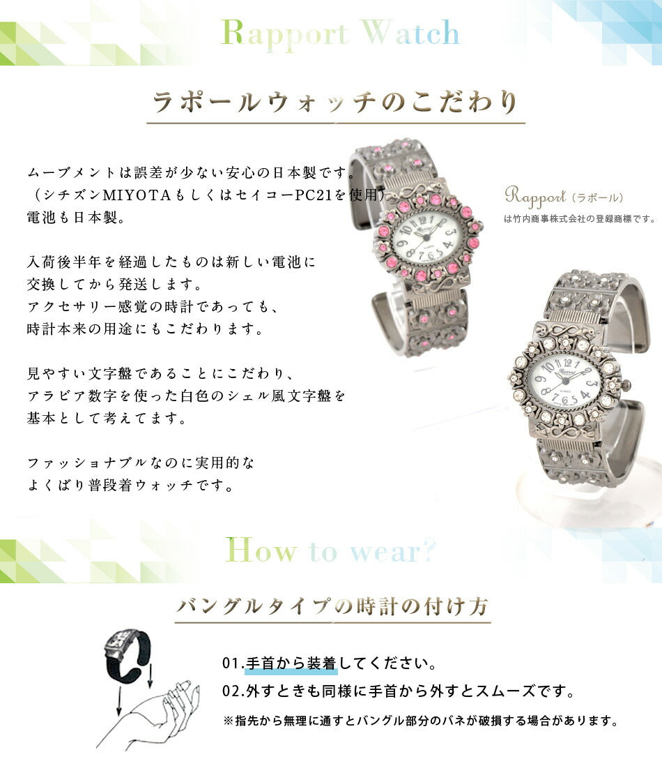 着脱簡単らくらくワンタッチなファッションウォッチ・バングルウォッチはお手軽で可愛いお洒落を楽しめます。 簡単装着できるので、朝学校や会社に行くときの忙しい時間でも腕にはめるだけで手抜きオシャレが完成。ブレスレット感覚のアクセサリーとして街中にお出かけデート、お散歩の普段使いとしても最適なレディースウォッチです。さらに他のアクセサリーとレイヤリングすることでもっとおしゃれになれます。個性的で華やかなデザインが多いのでインスタ映えもばっちりです!ごつめの重量感のあるデザインの物では男性でも楽しめる仕様かと思われます。時計は全て保証書付きでおりますので、初期不良・交換・返品等お気軽にお問い合わせください。ラポールウォッチは安心の日本製ムーブメントで実用的な女性用のかわいいカジュアルウォッチです。
