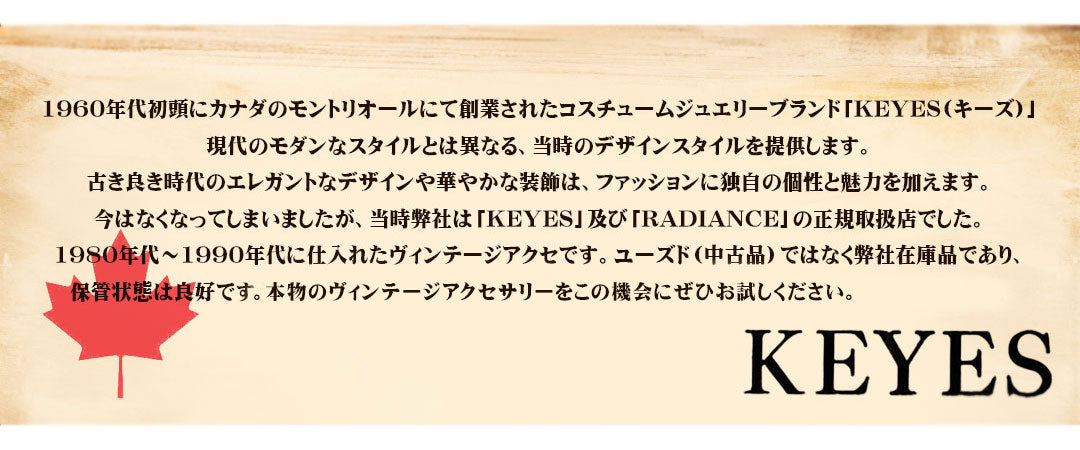 | 説明 | カナダのコスチュームジュエリーブランド『KEYES』のイヤリング。 今はなくなってしまいましたが、当時弊社は『KEYES』及び『RADIANCE』の正規取扱店でした。 1980年代〜1990年代に仕入れたヴィンテージアクセです。ユーズド(中古品)ではなく弊社在庫品であり、保管状態は良好ですが経年劣化はございますのでヴィンテージ品であることをご了承の上ご購入ください。 |