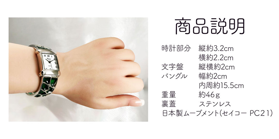 | サイズ | ・サイズ 時計部分 縦約3.2cm 横約2.2cm 文字盤 縦横約2cm バングル内周約15.5cm 幅約2cm 重さ 約46g |