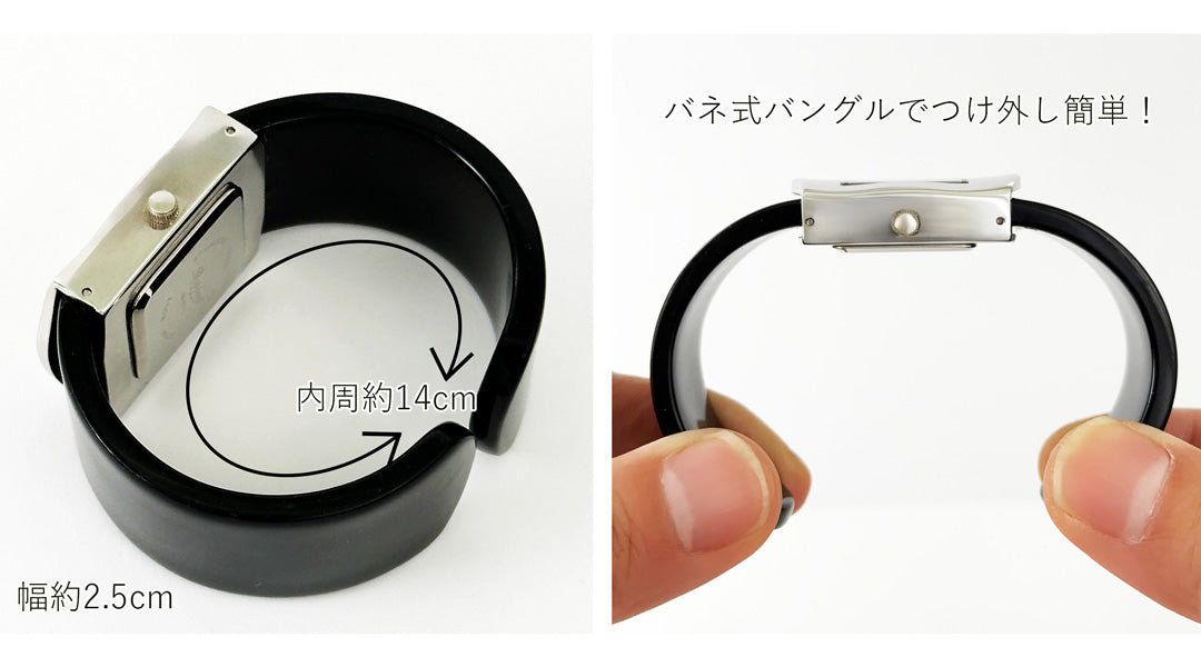 | サイズ | ・サイズ 時計部分 縦 約3.5cm 横 約2.8cm (竜頭含まず) バングル内周 約14cm 横 約2.5cm 重量 約42g |